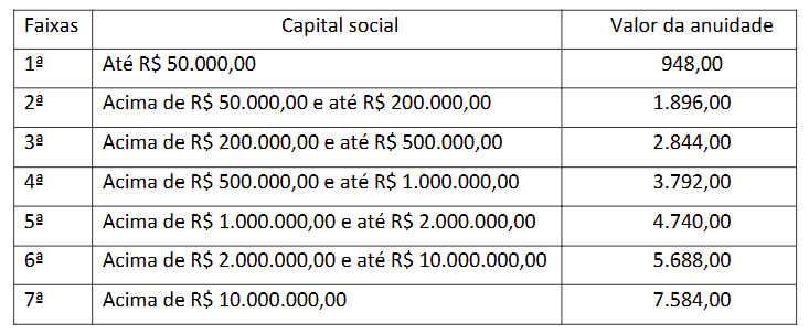 A anuidade de Pessoa Jurídica para o exercício de 2026, seja matriz ou filial, com vencimento até o dia 31 de janeiro, será cobrada de acordo com as seguintes classes de capital social: